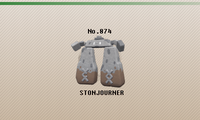 Stonjourner, the Big Rock Pokémon. The elemental composition of the rocks that form its body were found to match the bedrock of a land far away from this Pokémon's habitat. This Pokémon spends its life gazing at the setting sun. It strides leisurely across grassy plains on legs of rock that weigh over 400 pounds each.