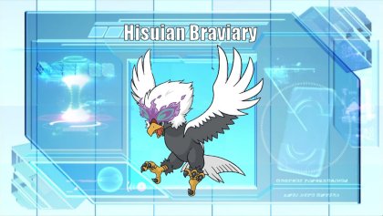 Hisuian Braviary, the Battle Cry Pokémon. Screaming a bloodcurdling battle cry, this huge and ferocious bird Pokémon goes out on the hunt. It blasts lakes with shock waves, then scoops up any prey that float to the water’s surface.