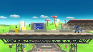 As there are Shy Guy racing through the track, they will sometimes come through to where you are battling. There is a board in the back that gives you notifications as to where the Shy Guy are so you can prepare yourself. The track is a looped one so they will come across both the button and the top of the level. If they hit you, they will cause damage and possibly KO you. However, you have the ability to damage them and stop them hurting you if you time it right
